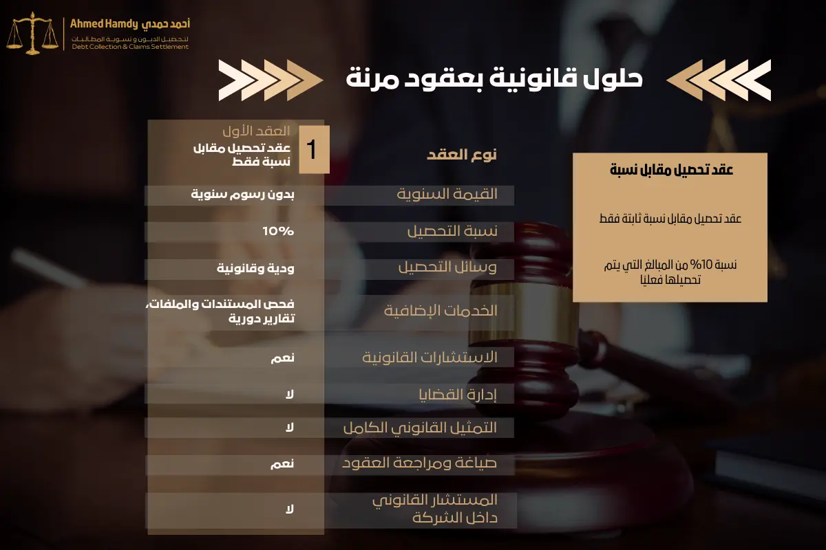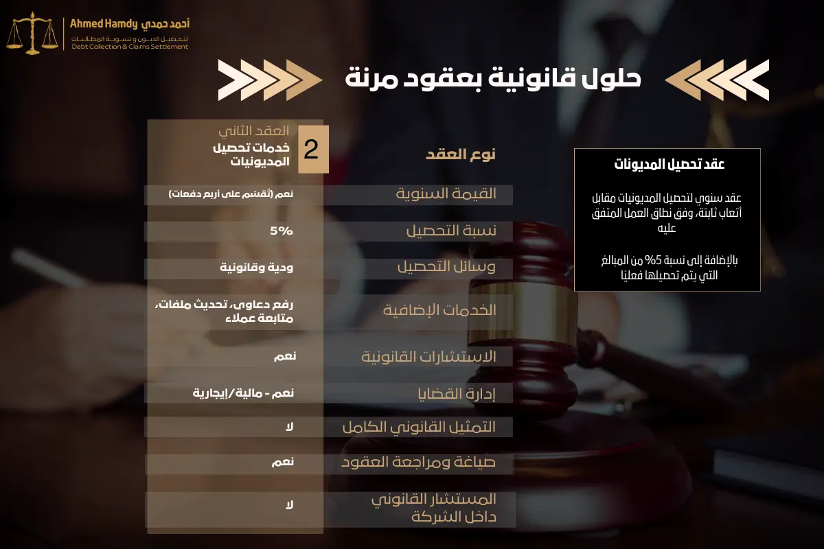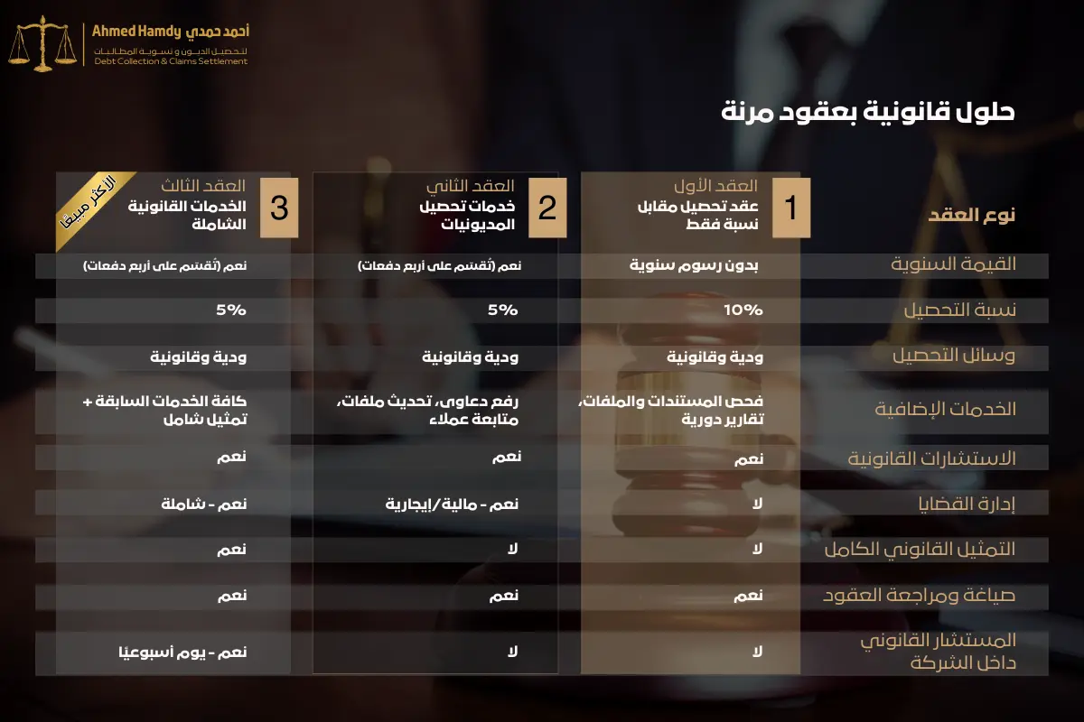 نحن مكتب محاماة واستشارات قانونية متخصص في تحصيل المديونيات، إدارة النزاعات، وصياغة ومراجعة العقود. نعتمد منهجًا يجمع بين الخبرة القانونية والفهم التجاري العميق لطبيعة أعمال عملائنا.